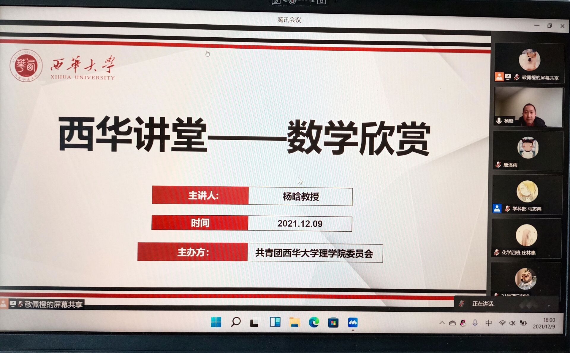 12月9日下午,为进一步激发同学们对专业的兴趣,帮助大家开拓视野,理学院开展了以“数学欣赏”为主题的线上西华讲堂,特别邀请西南交通大学数学学院执行院长,博士生导师杨晗教授来校作讲座,学院教师代表和数学、化学专业学生等300余人参加了本次讲座。