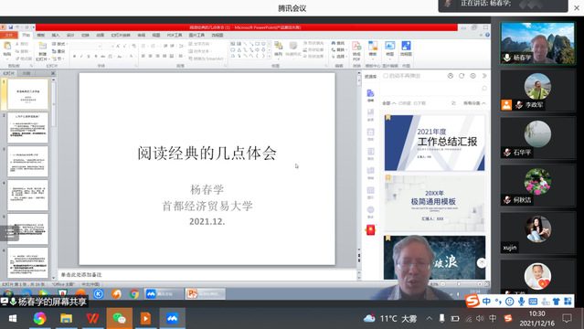 12月16日,应我校西方经济学教学团队首席教授李政军邀请,我国孙冶方经济学奖获得者、首都经贸大学教授、博士生导师、《美国经济评论百年经典论文》主译杨春学在腾讯会议室,以《阅读经典的几点体会》为题,给我校西方经济学教学团队成员作学术报告,并启动团队成员研读《美国经济评论百年经典论文》活动。学术报告会由李政军教授主持,参加报告会的人员有我校西方经济学教学团队成员和来自西南科技大学、北方民族大学、华侨大学、四川外国语大学、南京审计大学、阜阳师范大学等二十多所国内高校的教师。