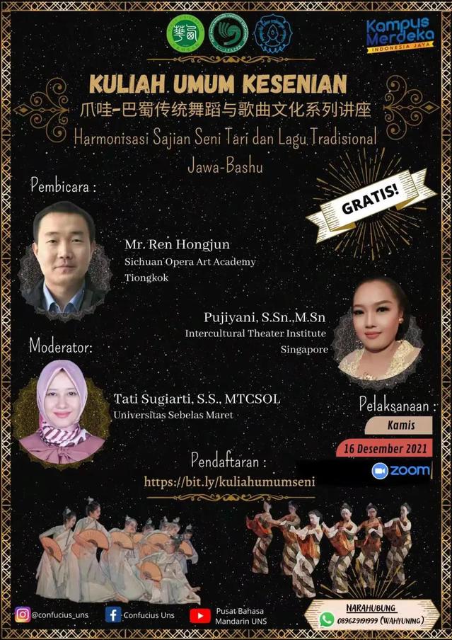 12月16日,三一一孔子学院举办了爪哇——巴蜀传统舞蹈与歌曲文化讲座。四川省艺术研究院任红军研究员、三一一大学文化交流中心普吉雅尼女士分别向与会者介绍了四川特色歌舞和爪哇歌舞。三一一大学孔子学院中方院长陆雨在会议致辞,三一一大学文化学院华尔多院长向会议致辞并宣布活动开幕。孔子学院外方院长潘范妮和孔院教师、来自三一一大学中文系和英国上市公司365文新学院的60余名师生参加了讲座。