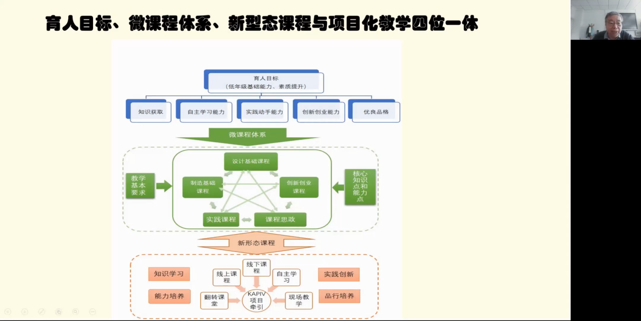 首先,孙康宁教授重点强调了“教学研究服务于立德树人”的观点,并提出了“为大学生构筑立德树人助力框架”的教学理念。他以传统大学课程体系为切入点,剖析弊端,有针对性地提出了KAPIV——包含大学生知识、能力、实践、创新和品行等要素的新形态课程解决方案。新形态课程不仅具有金课所具有的高阶性、创新性和挑战度等特征,还有着自身的特性:立德树人的引领性、育人的多功能性等。