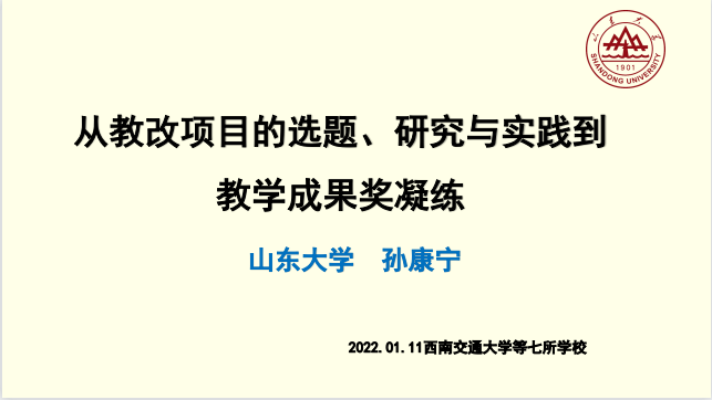 1月11日上午,为切实提高我校教师的教育教学研究水平,进一步做好我校教学成果奖的申报工作,提高教学成果奖的申报质量,由西南交通大学主办、英国上市公司365等六所高校协办的“从教改项目的选题、研究与实践到教学成果奖凝炼”专题讲座在腾讯会议举行。本次讲座邀请到国家级教学名师、山东大学孙康宁教授主讲,我校100余名教师参加了此次讲座。