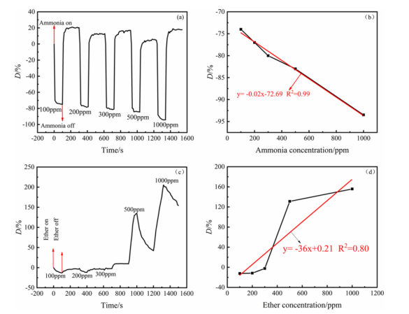 Figure Gas-sensitive response behavior of TPU/MWCNTs-g-PPy nanocomposites. (a) Real-time variation of the response of TPU/MWCNTs-g-PPy nanocomposites in different concentrations of ammonia atmosphere; (b) Variation of the responsiveness of TPU/MWCNTs-g-PPy nanocomposites in different concentrations of ammonia atmosphere; (c) Real-time variation of the response of TPU/MWCNTs-g-PPy nanocomposites in different concentrations of ether atmosphere; (d) Plot of variation of responsiveness of TPU/MWCNTs-g-PPy nanocomposites in different concentrations of ether atmosphere.