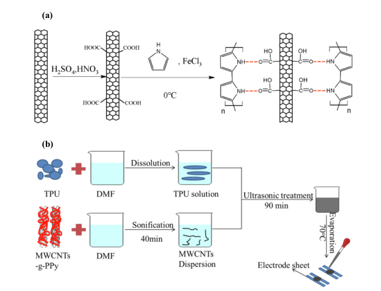 Figure (a) Principle diagram of the preparation process of MWCNTs-g-PPy conductive nanofillers; (b) The preparation process of TPU/MWCNTs-g-PPy conductive nanocomposites.