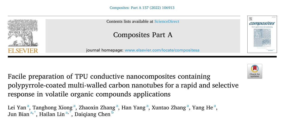 近日,我校材料科学与工程学院卞军教授“高性能高分子复合材料研究团队”在国际复合材料知名期刊Composites Part A(一区,IF:7.664)上发表了题为“Facile preparation of TPU conductive nanocomposites containing polypyrrole-coated multi-walled carbon nanotubes for a rapid and selective response in volatile organic compounds applications”的研究性学术论文。