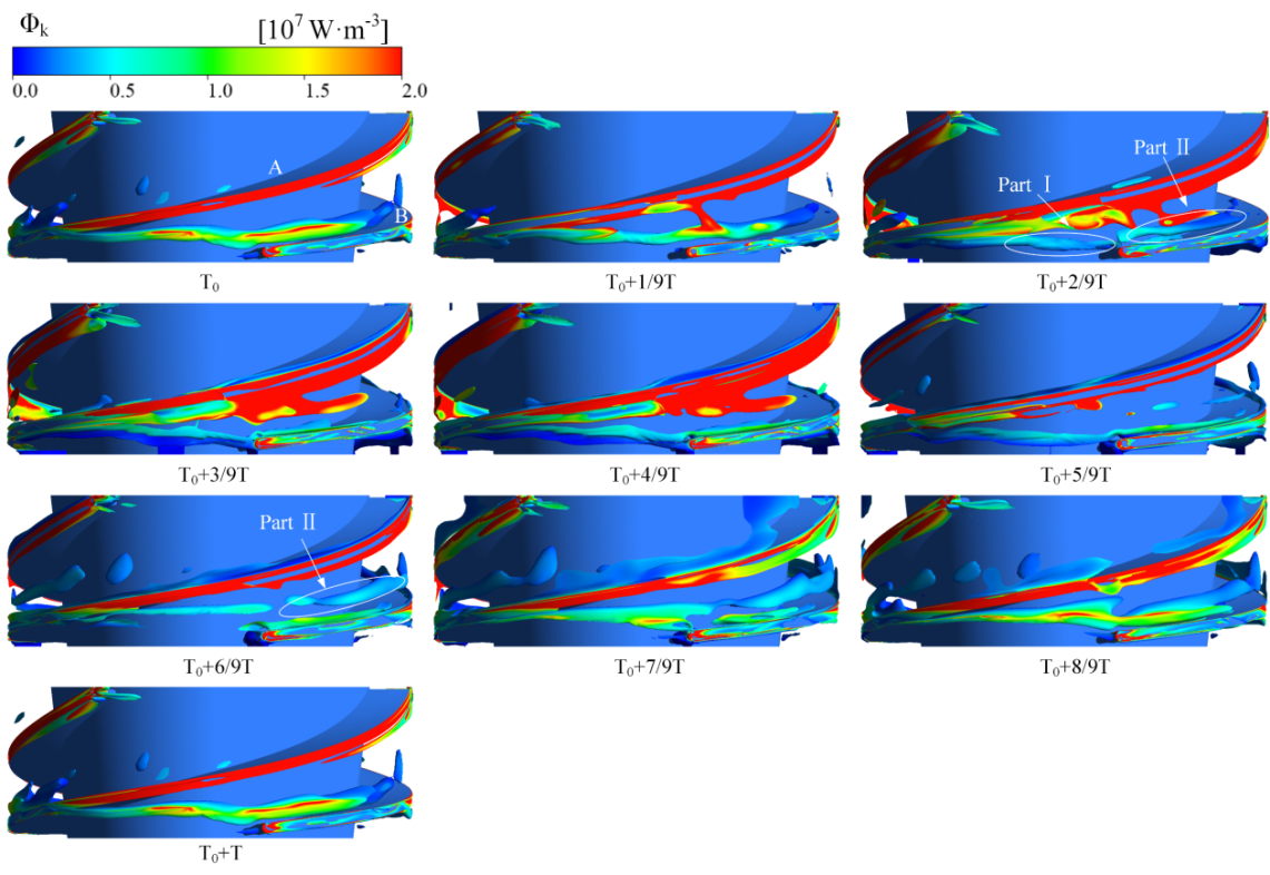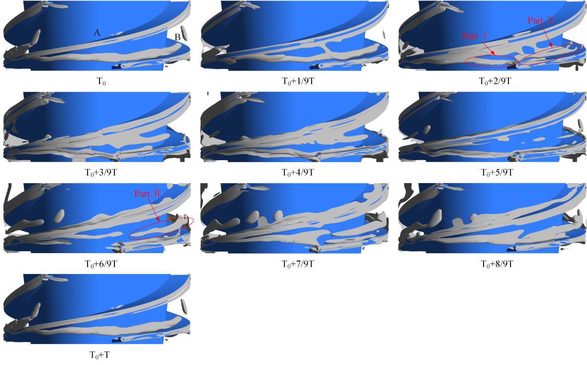 结果表明:混输泵叶顶泄漏涡结构包括前缘涡、叶顶分离涡、主泄漏涡、次泄漏涡和尾缘涡;在一个叶轮旋转周期内,叶顶泄漏涡的三维时空演化可分为分裂、收缩和合并三个阶段。相对涡旋拉伸项、科里奥利力和粘性扩散共同控制了叶顶泄漏涡的时空演化过程,是叶顶泄漏涡的涡量和轨迹变化的动力来源。气相的增加会恶化叶顶泄漏涡的流态,当含气率为10%时,体积旋涡拟能耗散功率增大45.33%,壁面旋涡拟能耗散功率减小23.90%,总旋涡拟能耗散功率增大17.21%。综上,通过研究深入揭示了叶顶泄漏涡对混输泵性能的内在影响。