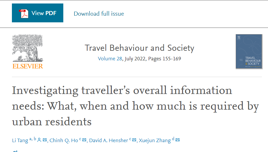 近日,我校汽车与交通学院唐立副教授在Travel Behavior and Society(二区,IF:4.983)上发表了题为“Investigating traveller’s overall information needs: What, when and how much is required by urban residents”的研究性学术论文。