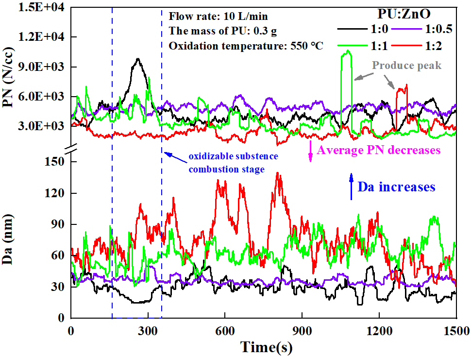 为探究DPF再生时颗粒的来源以及DPF再生性能的优化措施,团队采用模拟碳黑颗粒PU研究了不同再生温度、碳载量以及催化剂和灰的比例对其氧化性能以及排放性能的影响,研究结果表明,再生温度越高,气体和颗粒排放量越多,小粒径颗粒生成增加;碳载量增加会降低再生效率,促使大粒径颗粒产生;加入催化剂CeO2和活性灰ZnO可以有效降低CO的产生以及颗粒物的产生,促进再生,并且促使大颗粒物生成,为控制23nm颗粒的排放提供理论研究基础。