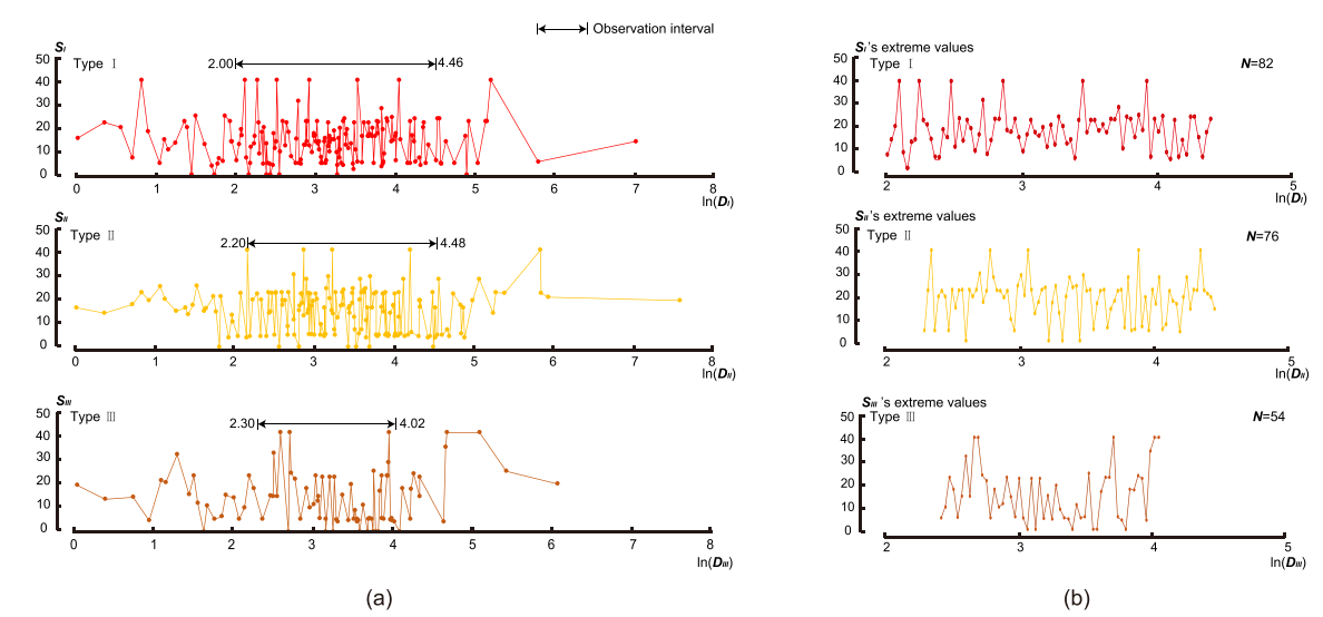 Fig 4. (a) The distributions of enterprises’ low-carbon degree (S) at different development levels(D); (b) The distributions of extreme S values for different enterprises.