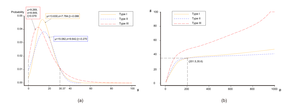 Fig 5. (a) The estimated GEV distributions of type I, II and III; (b) The estimated LCD in different development periods.