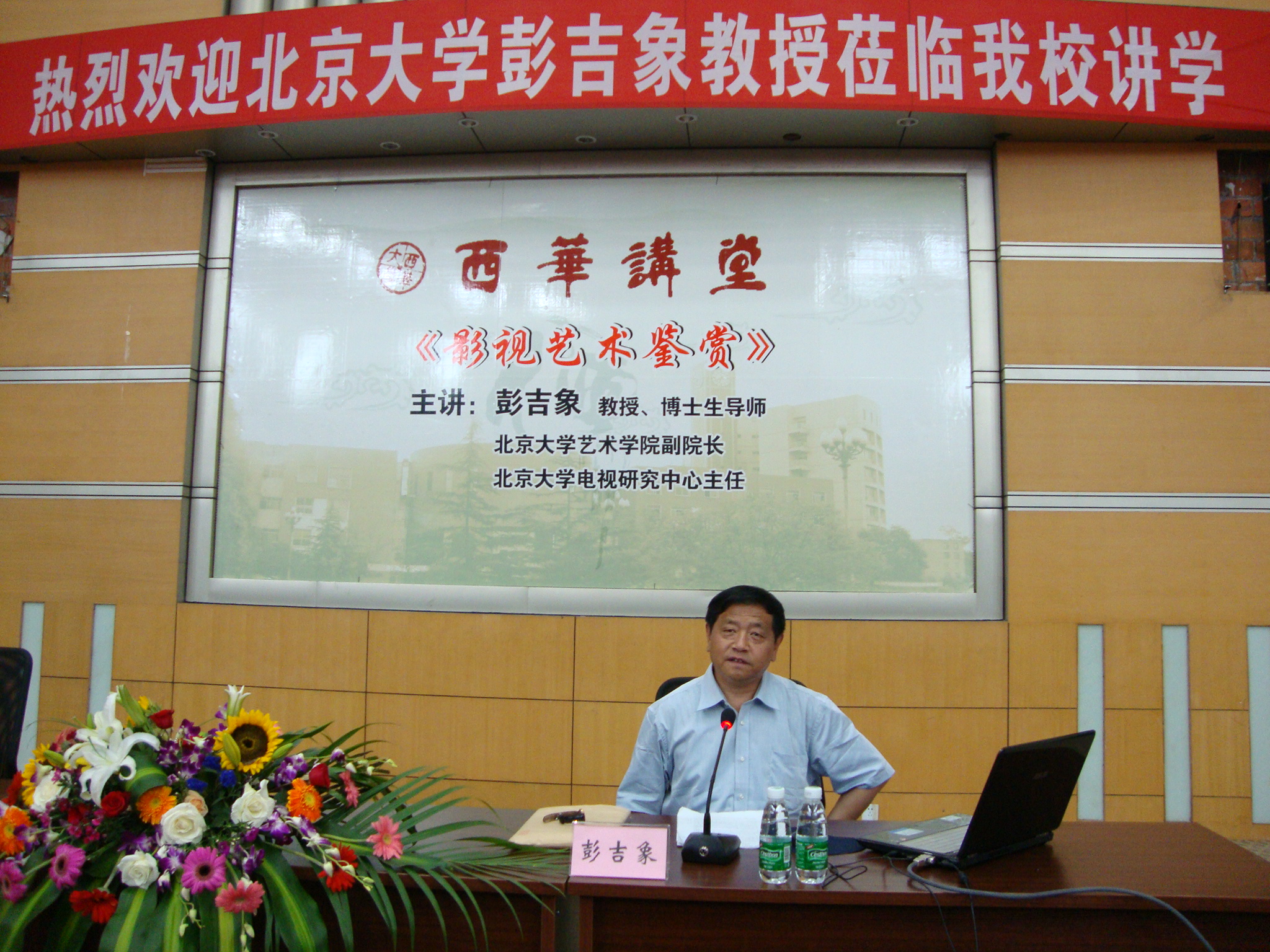 5月25日上午,北京大学艺术学院副院长、北京大学电视研究中心主任、教育部艺术教育委员会副秘书长、教授、博士生导师彭吉象教授应邀在四教报告厅为我校师生作了一场题为“影视艺术鉴赏”的学术讲座。全校师生三百多人聆听了讲座。 彭吉象教授回顾了世界电影与中国电影的起源,详细讲述了中国电影上个世纪三四十年代、五六十年代和八十年代的三次发展高潮,从历史反思、文化反思等角度展示了中国电影的百年艺术长卷,并现场播放了大量珍贵的老电影资料片段,使在场师生更好地了解影视艺术的相关概念,更形象地感受影视艺术的魅力。彭教授以渊博的学识、丰富的资料,旁征博引的风格,尤其是对《渔光曲》、《马路天使》、《一江春水向东流》、《枯木逢春》等中国电影史上经典作品的分析,让同学们真正理解了影片的现实主义内涵和对中国传统美学的继承,让我校师生在走近大师、聆听经典的过程中,从全新的角度重新领略这些银幕佳作永不磨灭的艺术魅力。