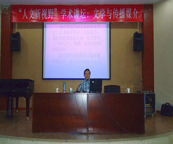 4月25日下午,应人文学院邀请,四川大学文学与新闻传播学院博士生导师冯宪光教授在临江苑报告厅作了题为“文学与传播媒介”的学术报告会。人文学院院长谢应光教授主持了报告会。 冯宪光教授提出了当今文学理论的重要问题,即“文学与传播媒介”的问题。冯教授通过雨果《巴黎圣母院》中的一段文字,说明文学在各个艺术门类中所处的位置。文学的发展与传播媒介息息相关,造纸技术的出现,实现了对各个艺术门类在人类社会生活中所处位置的重新洗牌,而随着新媒体技术的出现,必然对传统纸质文学产生极大的冲击。在文化产业化趋势下,纸质文学应该实现与新媒体技术的有效结合,同时,传统纸质文学并不会因为新媒体技术的发展而消亡,因为只有纸质文学可以给接受者提供孤独的阅读带来的情感上和思想上的体验。 讲座结束,在场的同学都表示受益匪浅,对文学与传播媒介的关系有新的认识,开拓了同学们认识文学的视野和眼界。 冯宪光教授正在讲学 |