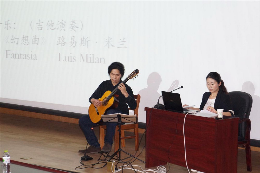 4月22日晚7:30,由艺术学院主办的关于文艺复兴至21世纪的西方古典音乐发展历程的讲座在新图书馆报告厅举行。此次主讲嘉宾是四川音乐学院音乐教育学院王文教授及吉他弹奏者四川音乐学院的约瑟夫·米兰蒂里亚。艺术学院的师生聆听了讲座。 讲座开始,王老师介绍了各个时期的风格主义和其代表人物,以及每种音乐的特征。每介绍一种风格,都会向同学们展示相关时期的音乐代表作,无论是激情昂扬的作品,还是优雅婉转的作品,无不散发着西方古典音乐的魅力。当然,这种充满活力的音乐讲坛自然也少不了现场的演奏,每一次的风格展示都在约瑟夫的吉他琴声中将大家带入音乐的世界,每一次吉他的发声,都是一次诉说。大家仿佛进入了西方古典音乐的海洋。 对于这次讲堂,虽然有些同学对西方古典音乐的发展历程了解的不多,但王文教授的生动讲谈以及约瑟夫的深情弹奏在同学们脑海中挥之不去,为同学们在平日的学习中,增添一抹亮色。 王文教授讲座现场 约瑟夫·米兰蒂里亚现场弹奏 |
