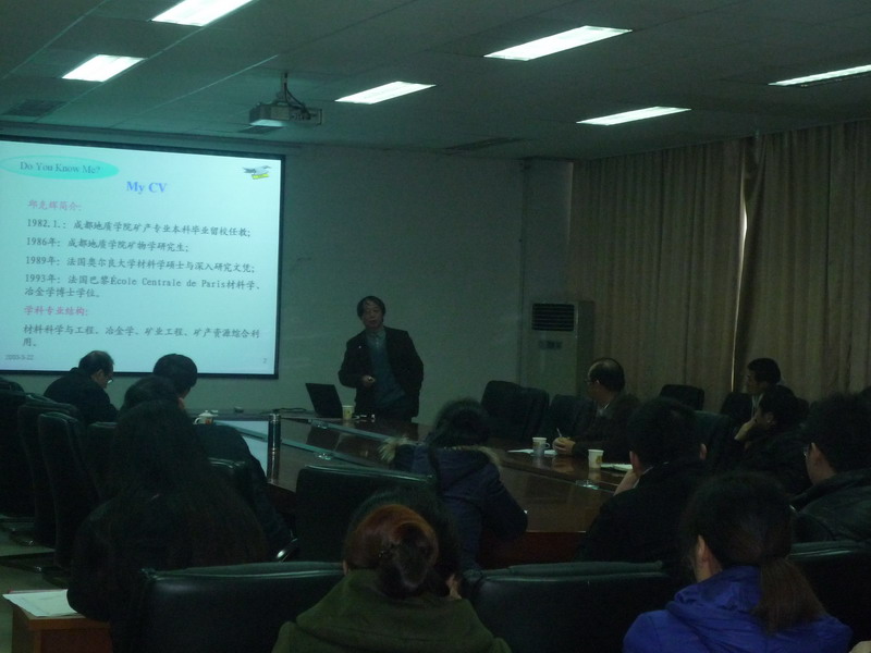 11月30日下午,成都理工大学材料科学技术研究所所长邱克辉教授应材料科学与工程学院邀请来校作了题为“钒钛资源材料与可持续发展”的学术报告。报告由学院院长魏晓伟主持,学院老师和研究生聆听了报告。 本次学术报告,邱克辉教授主要围绕钒钛资源材料与可持续发展进行讲解,他以主要的研究方向纳米材料和稀土为前导,首先简要介绍了美国MT矿治及材料的发展概况,引出我国钒钛磁铁矿目前的利用现状和水平。并以攀西钒钛磁铁矿的储量大、矿种独特的优势和特点和钨矿开发从丰富到枯竭的案例,提出了四川钒钛资料及其产业应坚持可持续发展之路,最后他还针对钒钛产业发展面临的科技含量有待提高,产品设计换代的问题,提出了发展钒钛发光的新材料的建议,并列举了几个目前成功的应用案例。 报告结束后,部分老师还与邱克辉教授就相关问题进行了深入的讨论,与会人员从中受益匪浅,对拓宽学院师生相关领域的视野起了极大的引导作用。 最后,院长魏晓伟对本场讲座做了简要的总结,并再次表达了对邱克辉教授的感谢,讲座在一片热烈的掌声中结束。  报告会现场