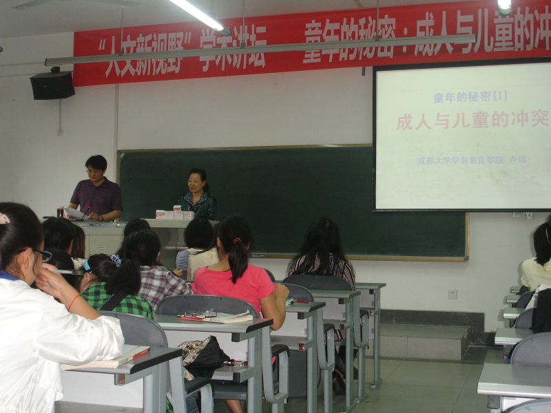5月30日上午,应人文学院邀请,成都大学学前教育学院副院长卢伟教授在6C--225给学前教育专业师生带来了一场题为《童年的秘密:成人与儿童的冲突》讲座,副院长潘殊闲主持讲座。 卢教授的讲座以一则美国幼儿故事开始,介绍了幼儿心理世界与成人的不同之处,激起了大家的浓厚兴趣。接下来,卢教授从三方面展开了对成人与幼儿冲突的阐述,即成人与幼儿冲突的表现形式、冲突原因以及冲突的解决方法。阐述中,卢教授结合幼儿心理学和教育学的相关理论,借助大量实例,告诉大家要从幼儿本位的角度理解幼儿成长。最后,卢教授还结合意大利蒙氏教育和瑞吉欧教育体系的特点,分析了当前国内外学前教育的差异性,并一一回答了师生们的提问。 整场讲座内容丰富,语言风趣,富有启发性,赢得现场师生的阵阵掌声。