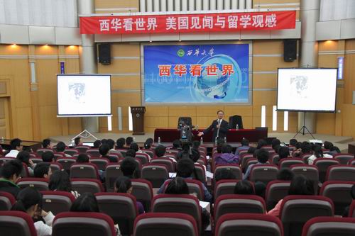 11月12日下午,“西华看世界”第一期讲座在四教报告厅如期举行。校长孙卫国作了题为《美国见闻与留学观感》的报告。400余名师生前来听取报告。 孙校长从美国国旗和国花切入,分别就美国的国家性质、人员结构、领土的扩张、早期的重大历史事件等几个方面,详细地讲述了美国是如何迅速崛起并发展成为头号强国的。其中,孙校长重点讲述了华盛顿等几位在美国历史上有重大影响的总统的经历,一个个充满哲思的故事,客观深入的剖析,使在场师生对美国有了更加深刻的认识,受益匪浅。 此次讲座为“西华看世界”第一期第一讲。据悉,在第二讲中,孙校长将从移民对美国的贡献、美国社会面面观等几方面更加深入的剖析美国文化与美国社会。