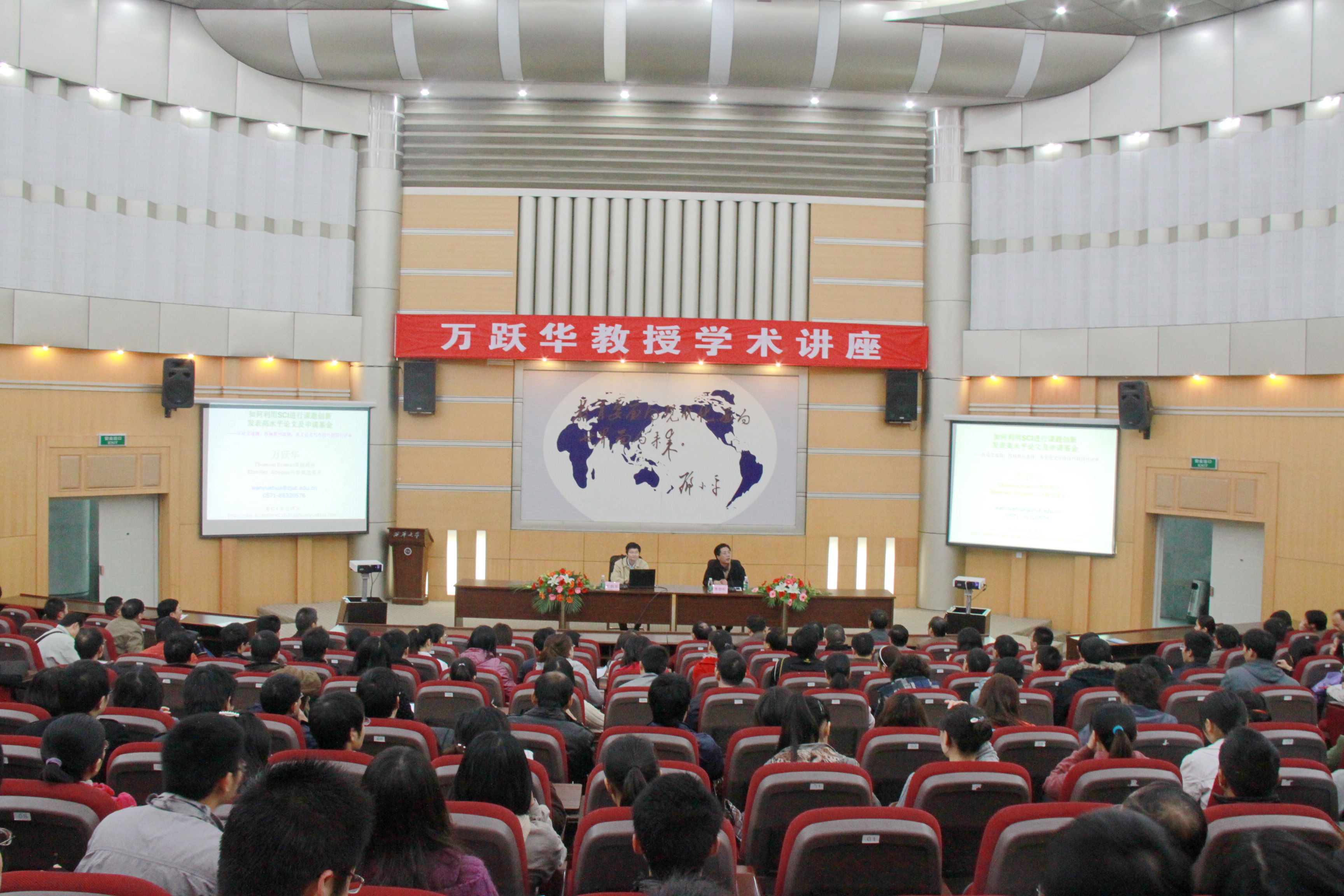 10月28日下午2:30,在四教报告厅,Thomson Reuters高级顾问、Elsevier Scopus内容甄选委员、浙江工业大学万跃华教授应我校科技处和图书馆的邀请,为广大师生带来了一场题为“如何利用SCI进行课题创新发表高水平论文及申请基金——从论文选题、投稿期刊选择、英文论文写作技巧到同行评审”的学术讲座。300多名青年硕士、博士,学校申请申报国家自然科学基金的教师等到场认真聆听了本次讲座。讲座由副校长李劲松主持。 李劲松副校长对万教授的基本情况作了介绍。他指出,此次讲座正值我校国家自然基金项目预申报阶段,希望老师们通过积极交流和学习,汲取知识,为实现学校的目标努力奋斗,为学校的发展做出更大的贡献。 万跃华教授结合他多年从事信息参考咨询的工作经验,从我校近年来SCI论文的收录及被引用情况谈起,分别从课题选择、论文写作、投稿技巧、课题申请等方面讲解了如何撰写高质量的科研论文以及如何提高发表SCI论文的命中率。此外,他还以大量的实例深入阐述了“SCI、SSCI、A&HCI收录原则”、“如何利用SCI数据库进行课题创新、发表高水平论文、申请国家基金”等问题。在讲座中,万教授还特别突出了一些起关键作用的细节,如论文标题及摘要引文的撰写要点,投稿的先难后易原则等等,指出了大家在平时论文写作及投稿中容易忽略的问题。 讲座内容丰富,资料详尽,既有较高的理论水平,又不乏实际应用的技能。讲座结束后,师生们争相就相关问题和万教授进行热烈而深入的探讨。许多师生表示,希望学校以后多开展类似的学术讲座,以提高广大师生的科研学术水平。