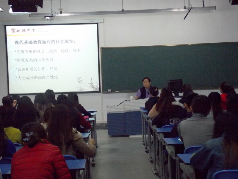 应人文学院邀请,4月25日下午,成都树德中学博瑞实验学校校长、四川师范大学硕士生导师、中学特级教师林毅先生莅临西华,为我校师生带来了一场以“现代基础教育背景下的教师素质要求”为题的精彩讲座。人文学院汉语言文学专业教育方向和外国语学院英语专业教育方向的同学聆听了讲座。人文学院院长谢应光教授主持讲座。 林毅先生首先从七个方面为同学们阐释了现代基础教育背景下的教师素质要求,启发同学们要具备过强的基础知识和过硬的基本技能,要“为学生的终身发展奠定基础,为学生的幸福人生奠定基础”。 随后,林毅先生分别从外部条件和内部因素两个方面阐释了现代教育的概念。他认为,现代基础教育具有大数据、信息化、多元化等特征,我们的教育应该培养学生面对现代、了解现代、适应现代、改善现代、引领现代的能力。他还谈到了现代教育面对的四个社会现实,即高度发展的社会、政治、经济、技术;纷繁复杂的世界格局;高速扩展的知识、经验;人才成长的高度个性化。针对这些现实,他希望同学们要有危机意识,不断与时俱进。 林毅先生还向同学们介绍了树德中学的办学理念以及学校对教师素质的要求。他说:“我们要像关心自己孩子一样去对待我们的学生,要将职业化的微笑转化为本能化的微笑。老师要有合格的学科能力,还要具备有时尚、时代性,不要远离学生,培养广泛的兴趣爱好。” 在最后的提问环节中,林毅先生一一耐心地解答了同学们提出的问题。讲座结束后,在场同学们纷纷表示受益匪浅。