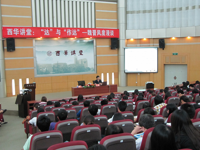 6月1日下午2:30,应人文学院邀请,四川大学教学名师、文学与新闻学院硕士生导师王红教授给西华师生带来了一场题为“‘达’与‘作达’——魏晋风度漫谈”的讲座。讲座由校团委主办,人文学院承办。人文学院副院长潘殊闲主持讲座。 讲座一开始,王红教授从《世说新语》说起,指出了汉末魏晋是我国精神最先进的时代,并以宗白华先生的《论<世说新语>和今人的美》论述了晋人“达”的作风。紧接着,她从《世说新语》中列举了一系列“放达”人士的例子。其中“竹林七贤”最为突出,阮籍不遵丧礼,其侄与猪共饮等真实例子,生动呈现了晋人的“放达”情怀。然后,王红教授又以儒道两家对“达”的不同看法进行了辨析,解释了阮籍为何自己放达却不让儿子‘作达’的原因。讲座的最后,王红教授从正始到元康划分出了魏晋名士的三个阶段,区分了一开始的“达”和最后的“作达”, 也提炼出了一个时代的主流意识。讲座结束后,王红教授与在座的同学们进行了现场交流。 此次讲座让同学受益匪浅,使大家更好地认识了魏晋时期士人的风雅,激发了大家对文学的兴趣,加深了对传统文化的感知领悟。 师生认真聆听讲座