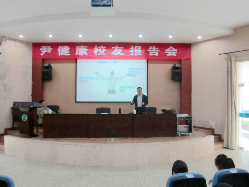 尹健康校友通过生动、形象的PPT阐释了高中生活和大学生活在各方面的不同,提醒新生在大学相对宽松的学习环境中,要具备“精、气、神”,否则很容易迷失自己。