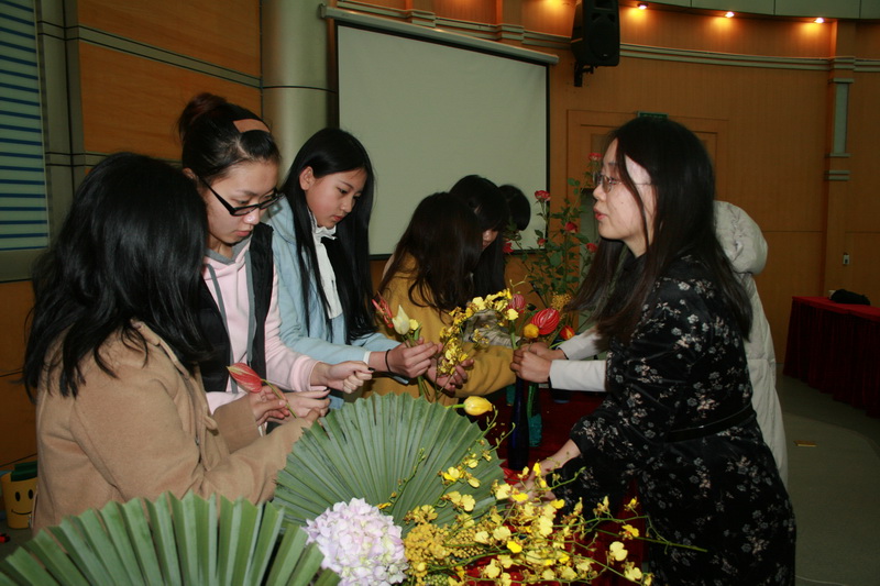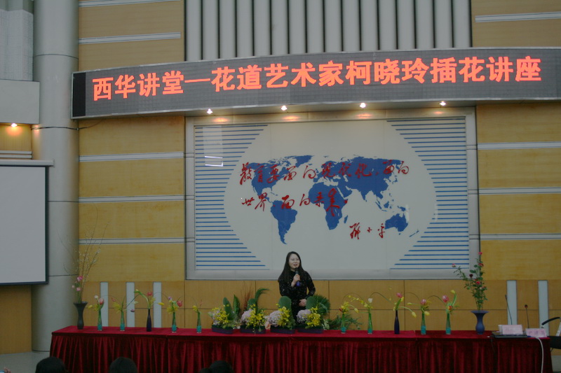 2月24日下午2点,著名插花艺术家柯晓玲老师在四教报告厅为我校同学带来了一场生动精彩的花道艺术讲座。外国语学院部分教师和日语系同学共计200多人到场聆听了讲座。 首先,柯晓玲老师为大家简单介绍了“花道”的涵义,花道又称“华道”、日式插花,它不单要表现花的美态,也是形神兼备品味造型的一种插花艺术。为了使大家能够更进一步地理解华道艺术,柯老师又对华道的三流派、池坊花道的历史基本形态及其三大主枝进行了介绍。随后的趣味问答更是激起了大家对花道艺术的热情。此时柯老师拿出从上海带来的一枝枝美丽的鲜花,为大家现场做出了花道展示。修剪、弯折、摆放,经过柯老师的一双巧手,不同的花朵完美的结合成一幅幅美丽的作品。 同学们也都按耐不住对插花艺术极大的兴趣,不少人跃跃欲试想要亲自来体验这项关于美的艺术。现场同学们踊跃地与柯老师互动,上台与柯老师共同制作了插花,大家用手中的花朵发挥自己的想象,把美丽的花枝错落有致地拼插在一起,形成美丽的插花艺术品。最后,柯老师用象征友谊的植物把同学们制作的插花连在一起,也把最美好的祝愿送给了现场的同学们。 “花道”不仅是日本传统艺术之一,也是中国传统文化的精髓之一。柯老师希望有更多的同学能够喜欢上这门传统艺术,热爱花道艺术。花道所要呈现的是一件美的事物,同时也是一个表达的方式、修炼的方式,希望同学们通过认识花道,了解花道和学习花道艺术,热爱自然,热爱生命,热爱生活!