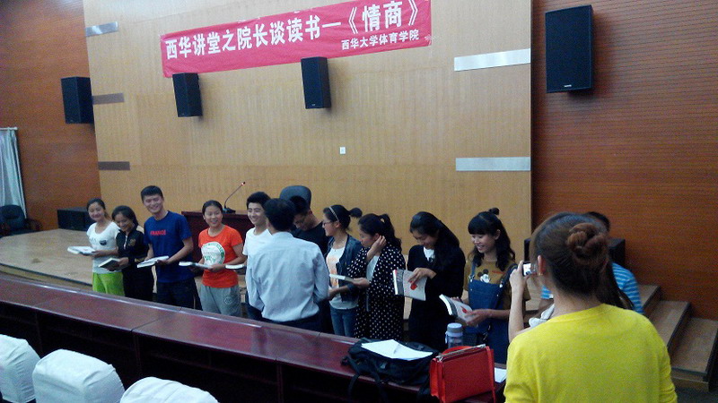 5月7日晚7:00,由体育学院承办的西华讲堂之院长谈读书活动在图书馆报告厅开展,体育学院院长胡志担任主讲人,学院团委书记孙颖老师主持活动,各年级专业同学代表参与。 开讲之前首先进行了赠书仪式,胡志院长对各年级优秀同学代表赠与丹尼尔·戈尔曼所著的《情商》。接着胡志院长由新东方创始人俞敏洪的事迹引出今天的主题“情商”,高情商人的特点有:能力较广泛、有雄心、有效率、热爱社交、乐观外向、乐于助人、善于奉献、有很强的责任感、亲和力强等。 胡志院长希望大家的观念从现在开始转变为从重“智商”到重“情商”。他阐述了推荐《情商》的10个理由,其中几个重要理由是:不懂情商的人是不健全的、情商高是一种最基本的生存能力、情商占取得事业成功中的大部分因素、情商能够教会大家如何培养人际关系,自我调节能力等。最后,胡志院长总结了情商的概念,就是管理情绪的能力。 听了胡志院长的讲座后,同学们表示更加透彻的理解到了“情商”的概念,明白了“情商”的重要性,并都希望能做一个“高情商”的人。
