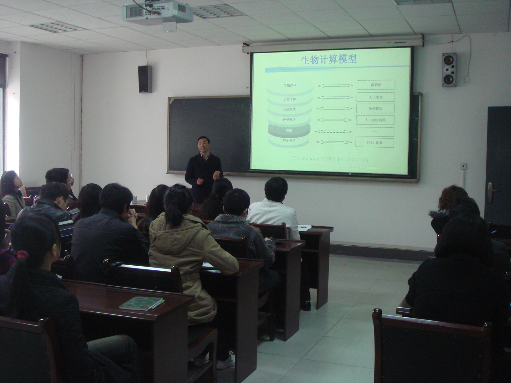 4月14日下午4:00,应电气信息学院邀请,西南交通大学博士生导师张葛祥教授在我校6A-314作了题为“自然计算的新分支—膜计算”的学术报告。相关专业方向教师和学生参加了此次报告会。 张葛祥教授介绍了膜计算的基本概念、基本原理及其研究进展,并着重讲解了近年来他本人及其团队在膜算法方面的成果,特别是利用膜计算原理求解优化问题及其在雷达方面的应用。,最后张张葛祥教授还与大家进行了现场交流并展开了激烈的讨论。 通过此次会议,使现场师生了解到膜计算的国际动态,开阔了视野,为今后的研究提供了新思路。 报告会会场 |