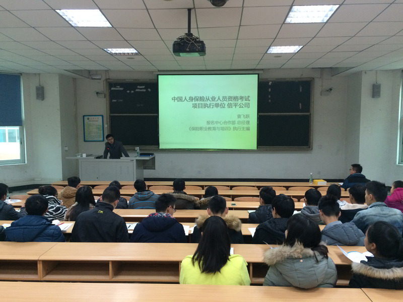 1月14日早上十点,经济学院在四教召开了保险前沿与从业人员资格项目讲座。学院邀请中国人寿保险从业人员资格项目总经理、《保险职业教育与培训》的执行总编袁飞跃老师作为主讲人,学院党委副书记兼副院长郑宇,团委书记刘雪梅以及保险专业的同学们参加了此次讲座。