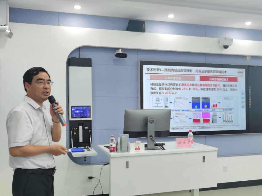 在报告会上,徐宝才教授分别从预制菜产业发展的时代背景、产业现状及挑战、产业核心技术以及未来发展趋势等方面为师生全面介绍了预制菜的产业与未来的发展方向。同时,徐教授结合团队的科研方向具体且深入地讲解了预制肉制品加工贮藏的关键技术及产业化研究,为师生奉上了一场精彩的学术报告。