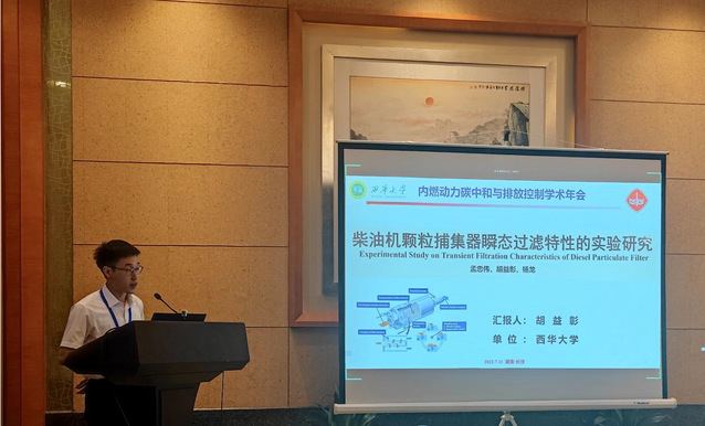 孟忠伟教授团队三名研究生胡益彰、曾渤淞、邓盟也分别进行了论文宣读,并与在场专家、同学们进行了相关研究内容的讨论。其中作者为孟忠伟、胡益彰、杨龙的论文“柴油机颗粒捕集器瞬态过滤特性的实验研究”在会后被遴选为本次大会的优秀论文,该论文研究了柴油机颗粒捕集器在发动机瞬态工况下的工作特性,其创新性引起了相关学者的广泛兴趣。