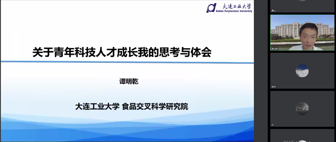9月13日,大连工业大学食品交叉科学研究院院长谭明乾教授为我校青年教师带来以“关于青年科技人才成长我的思考与体会”为题的报告。食品与生物工程学院院长唐洁教授主持本次会议,食品与生物工程学院和大健康管理学院近百位教师线上参与学习和交流。