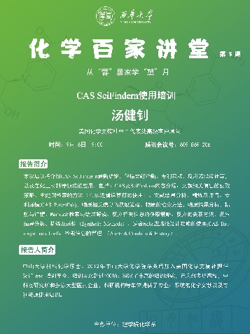近期,理学院推出了化学百家讲堂,由化学系承办。围绕从“蓉”居家学“塑”九月主题,分别邀请电子科技大学孙旭平教授、吉林大学张越涛教授、北京化工大学许家喜教授、中南大学蓝敏焕教授、北京理工大学董宇平教授作有关纳米功能材料、受阻lewis酸碱实现精准合成、有机合成和立体化学、碳点设计和应用、聚集诱导发光等方面的学术报告,汤健钊顾问作线上Scifinder学术技能培训。