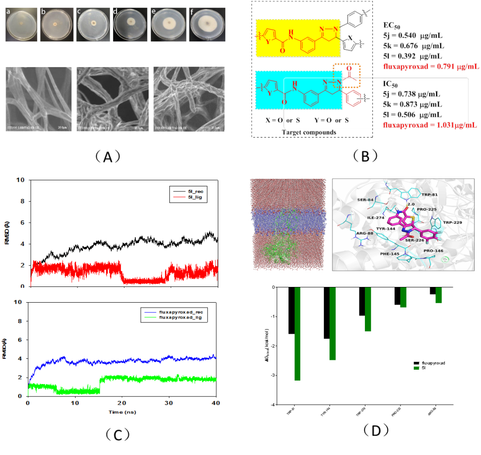 计算机模拟结果表明,化合物5l对SDH的结合能力强于氟吡菌酰胺,进一步验证了目标化合物设计的科学性和合理性;提供了具有潜在应用价值的候选化合物,为新型杀菌剂的研究与应用奠定了一定的基础。