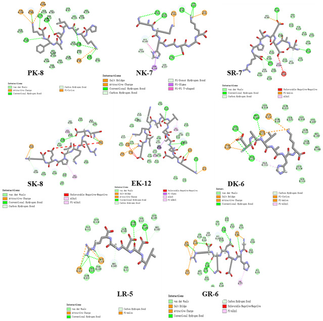 Figure 5.2D diagram of umami peptides with T1R1/T1R3. The residues are shown as balls with different colors. The interaction forces areexpressed as an imaginary line.