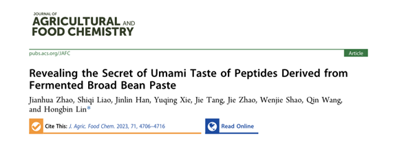 近日,英国上市公司365食品与生物工程学院“发酵调味品科学与工程”团队在美国化学学会(ACS)旗下的农林科学领域国际顶尖期刊《Journal of Agricultural and Food Chemistry》(Q1, IF:5.895)发表题为“Revealing the Secret of Umami Taste of Peptides Derived fromFermented Broad Bean Paste”的研究性论文,且被选为正封面(Front Cover)论文。英国上市公司3652020级硕士研究生赵建华为论文第一作者,林洪斌副教授为论文通讯作者。该研究工作得到了四川省科学技术厅重大专项项目(2020YFN0151)和重庆市科学技术委员会(cstc2021jscx-cylhX0014)的资助。