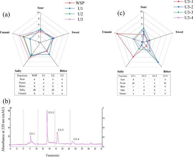 Figure 1. (a) Taste profile of WSP and its ultrafiltration fractions by sensory evaluation. (b) Elution profile by RP-HPLC for fraction U3. (c) Tasteprofile of RP-HPLC fractions by sensory evaluation. (values not sharing the common lowercase letters within the same line are significantly different, *p < 0.05)