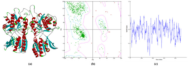 Figure 3. Structure and reliability of the homology model of T1R1/T1R3. (a) Structure of T1R1/T1R3. (b) Raman map of T1R1/T1R3. (c)Verify-3D of T1R1/T1R3.