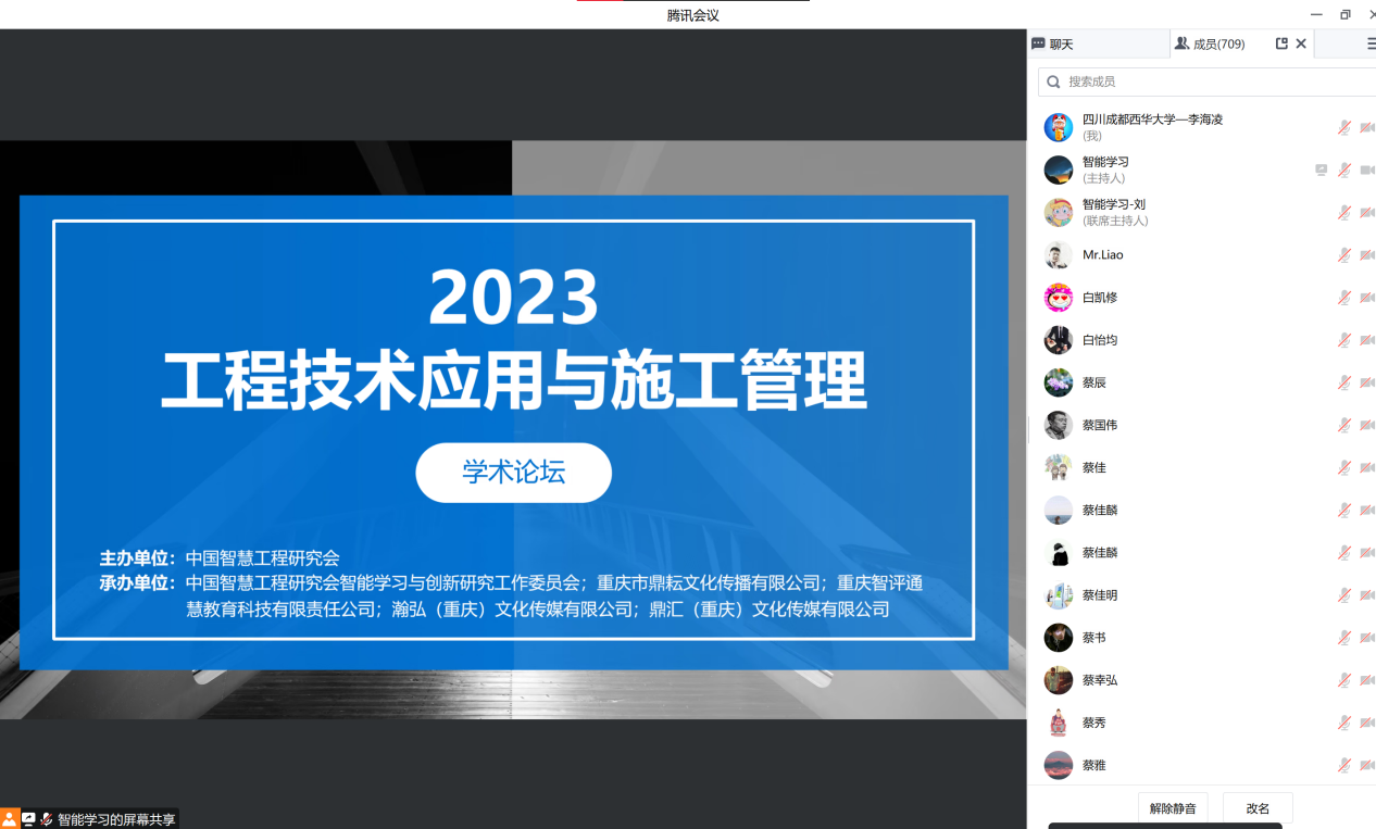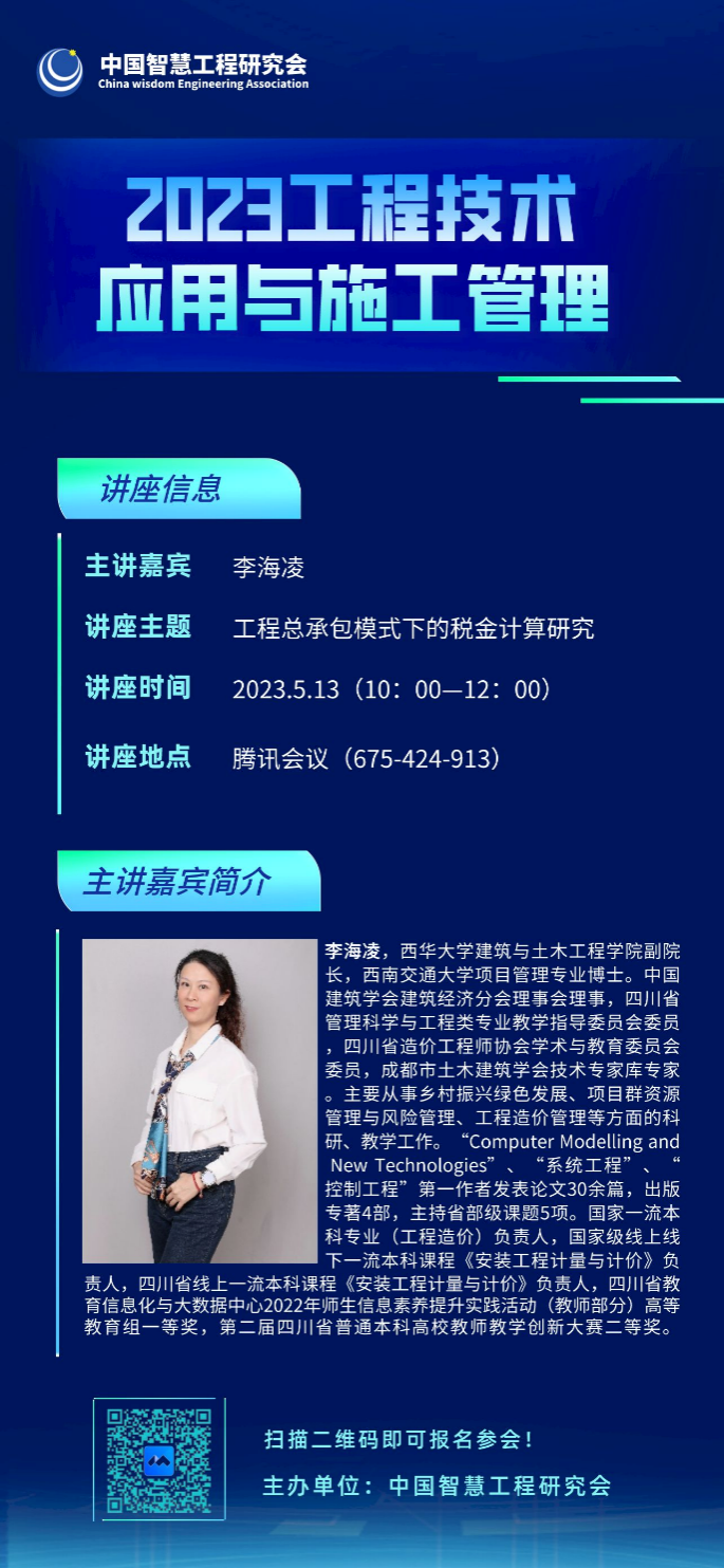 5月13日,建筑与土木工程学院副院长李海凌教授受邀参加了由中国智慧工程研究会主办的2023年工程技术应用与施工管理学术论坛,并作了题为《工程总承包模式下的税金计算研究》的学术报告。