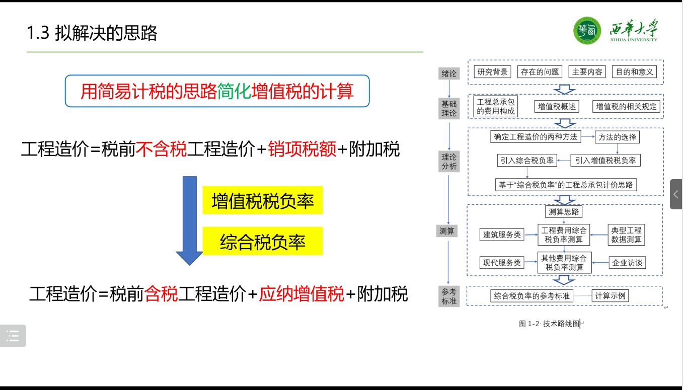 李海凌教授介绍了报告课题的来源,分析了实践中存在的增值税认识偏差,对偏差产生的问题根源进行了深入分析和详细阐述,指出“人为除税计算税前工程造价”已不再适合工程总承包模式下的造价确定,提出用简易计税的思路简化增值税的计算。通过引入增值税税负率和综合税负率,实现“工程造价=税前含税工程造价+应纳增值税+附加税”的计算。
