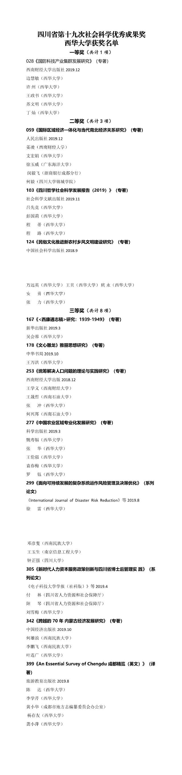 吕先竞教授、彭国莉教授等编写的专著《四川哲学社会科学发展报告(2019)》获二等奖,张力教授、万远英教授、王贝教授等编写的专著《民俗文化推进新农村乡风文明建设研究》获二等奖。支宏娟等参编的专著《国际区域经济一体化与当代南北经济关系研究》获二等奖。